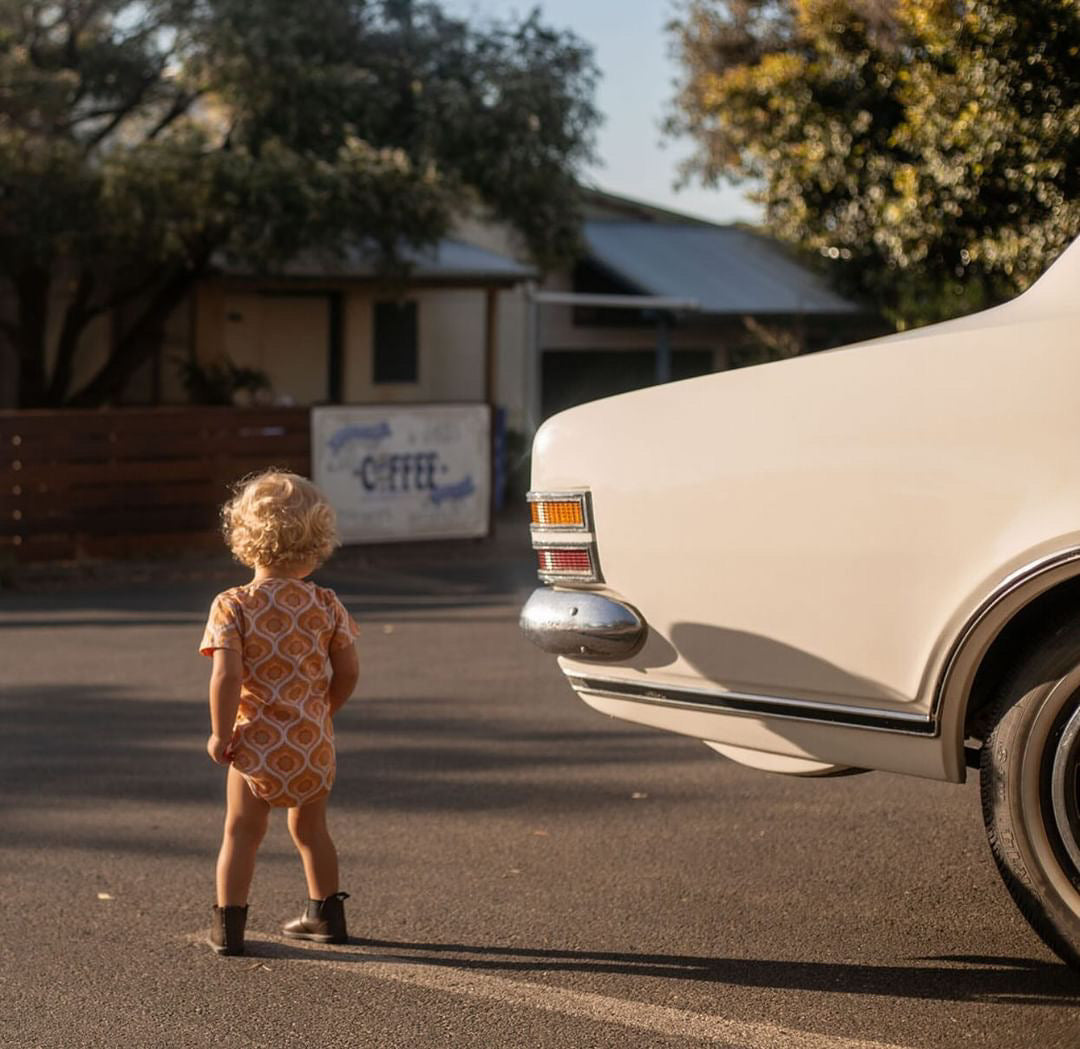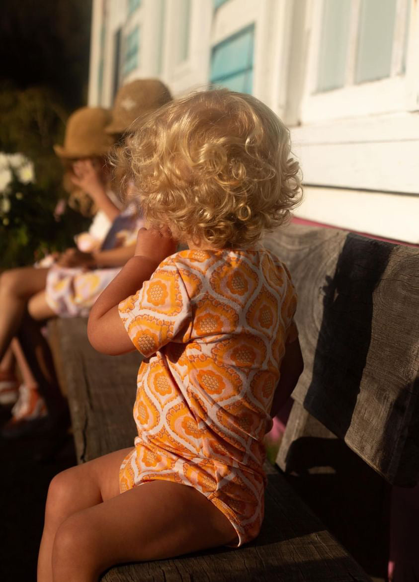 Step out in 70's style in our Zimi Sleep suit. Handmade and printed using soft organic cotton. Match back with a cute pair of our Hazel Bells.